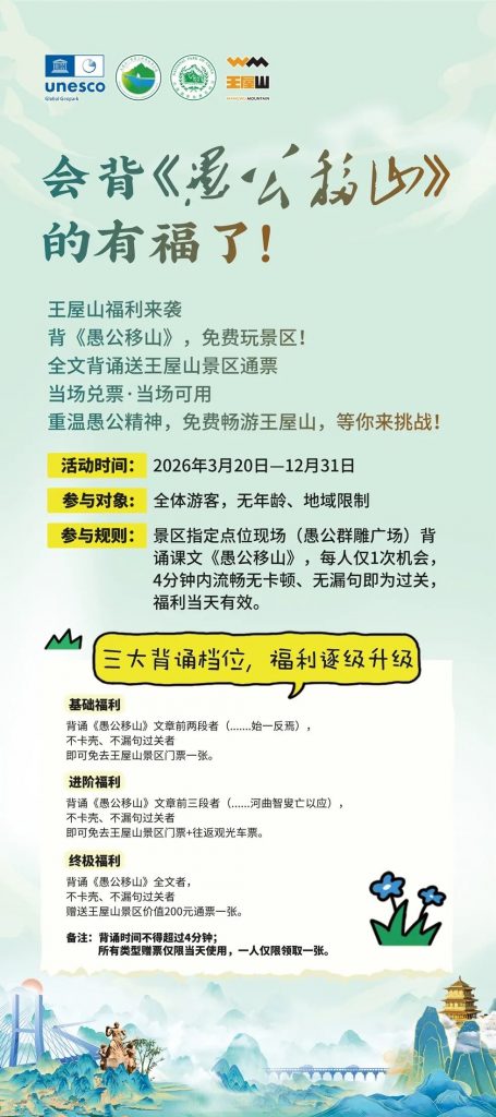 背诵课文《愚公移山》免票畅游活动持续在线,多重福利梯度解锁,用知识换门票,老少皆宜!建议参与背诵活动的朋友们,直接到愚公群雕广场背诵点参与活动后入园!