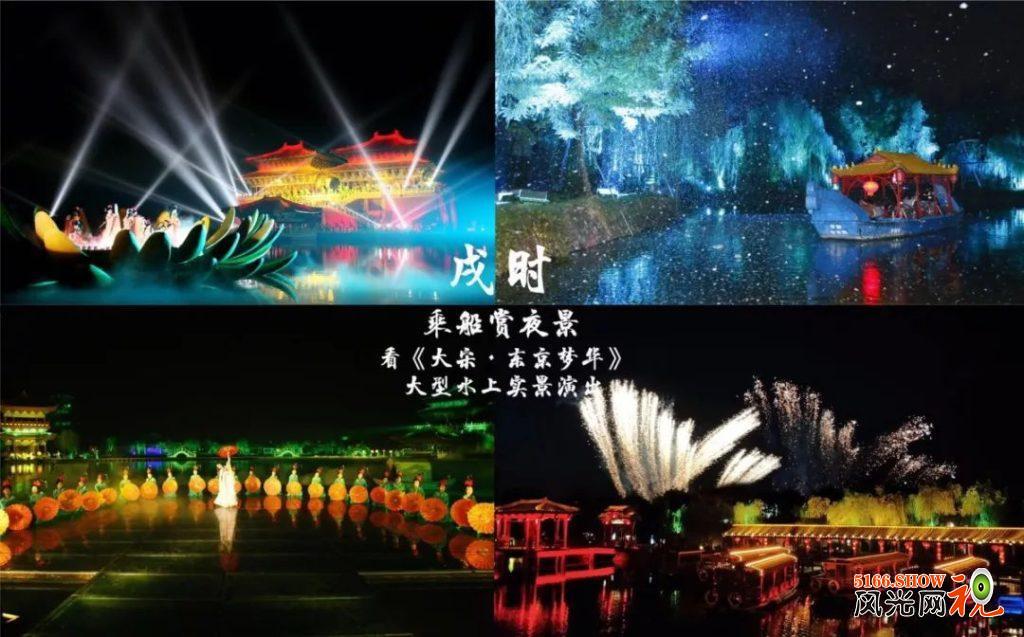 结束了一天的喧嚣,夜晚的风渐渐凉了下来。新人们可以乘船看《大宋·汴河灯影》,再来到景龙湖畔欣赏水上实景演出《大宋·东京梦华》,感受悠长意境。