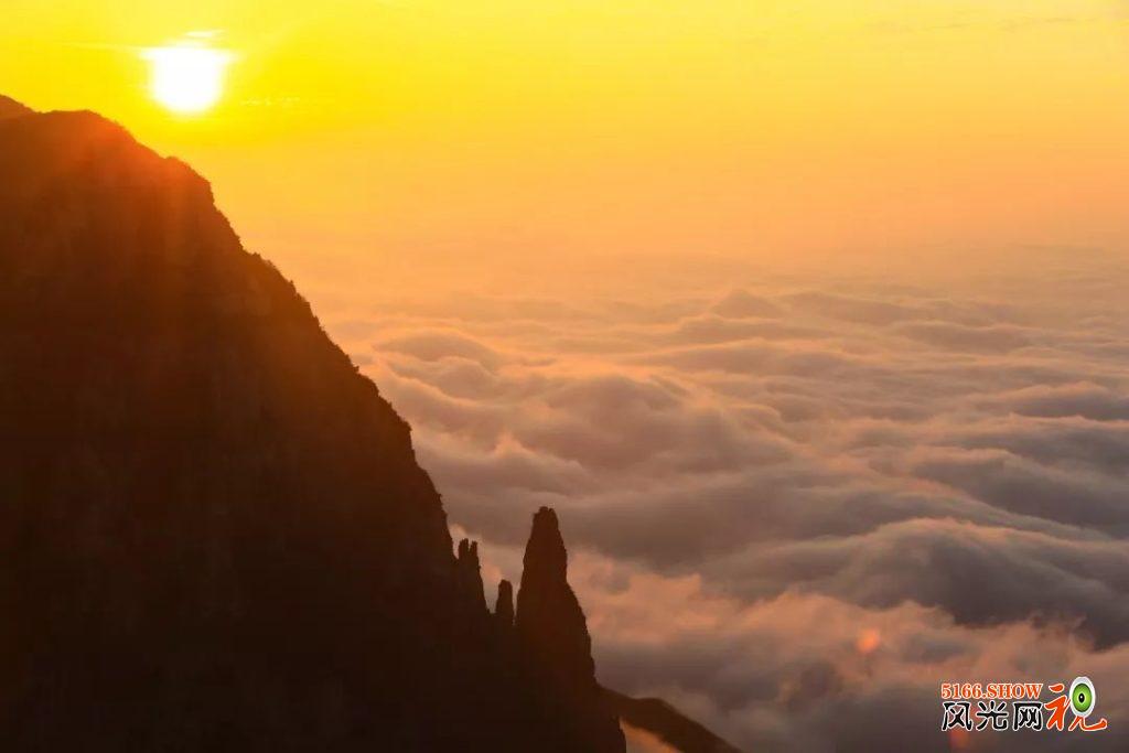清晨,阳光在每个裂缝中散落,云雾开始翻涌,山峦渐渐清晰。云雾如海潮般缠绕着山峰,似海市蜃楼般震撼。