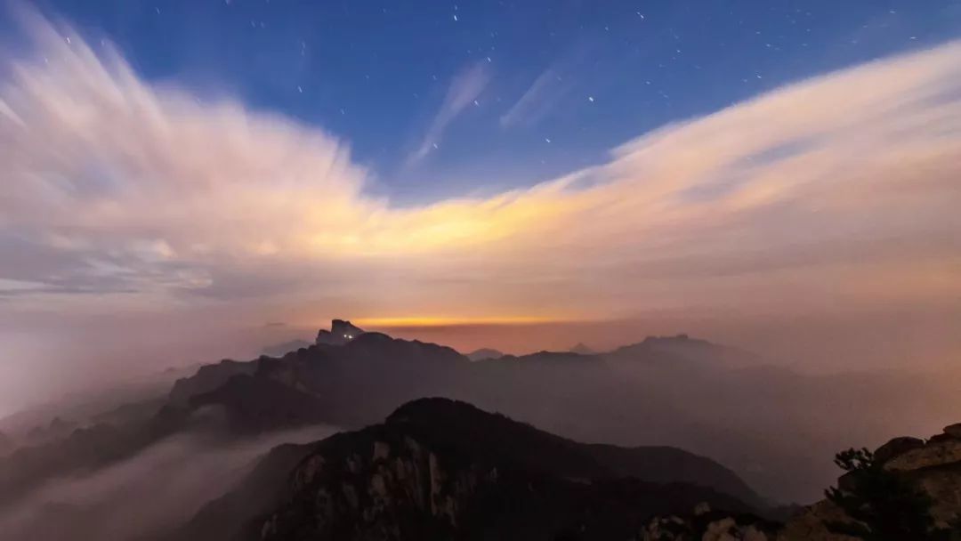 随着太阳升高,云层逐渐下降,露出的山峰好似一座座海上小岛在千山万壑之间,玉皇顶,鸡角曼,光明峰