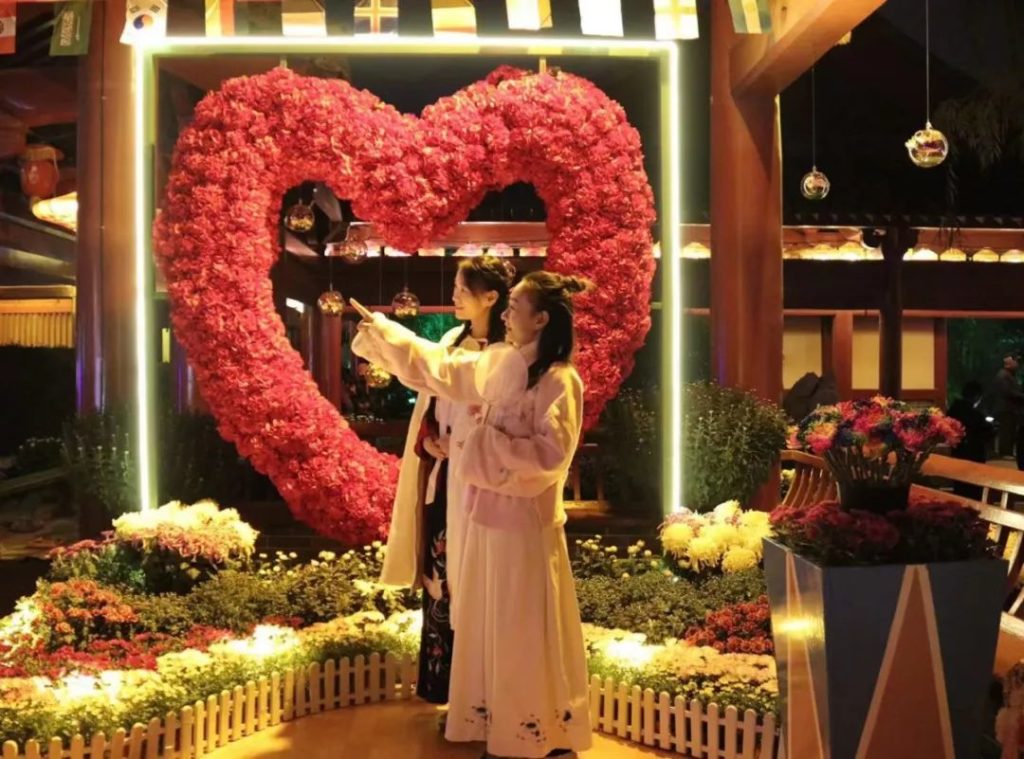 百万株菊花在夜晚灯光的映衬下,