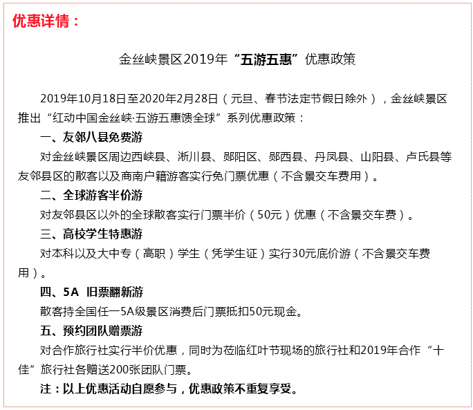 本次活动最大的亮点是景区惊爆眼球的巨幅优惠,据悉,2019年10月18日至2020年2月28日(法定节假日除外),金丝峡景区推出“红动中国金丝峡·五游五惠馈全球”组合优惠,一是对商南县及友邻八县实行免费游;二是对全球散客实行半价游;三是对高校学生实行30元特惠游;四是散客持全国任一5A级景区消费后门票游览金丝峡可抵扣50元现金;五是对莅临红叶节现场的旅行社实行赠票游。