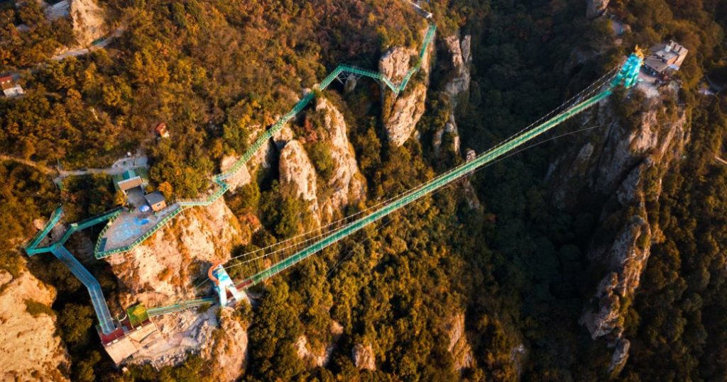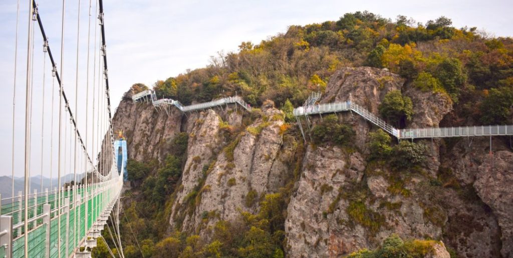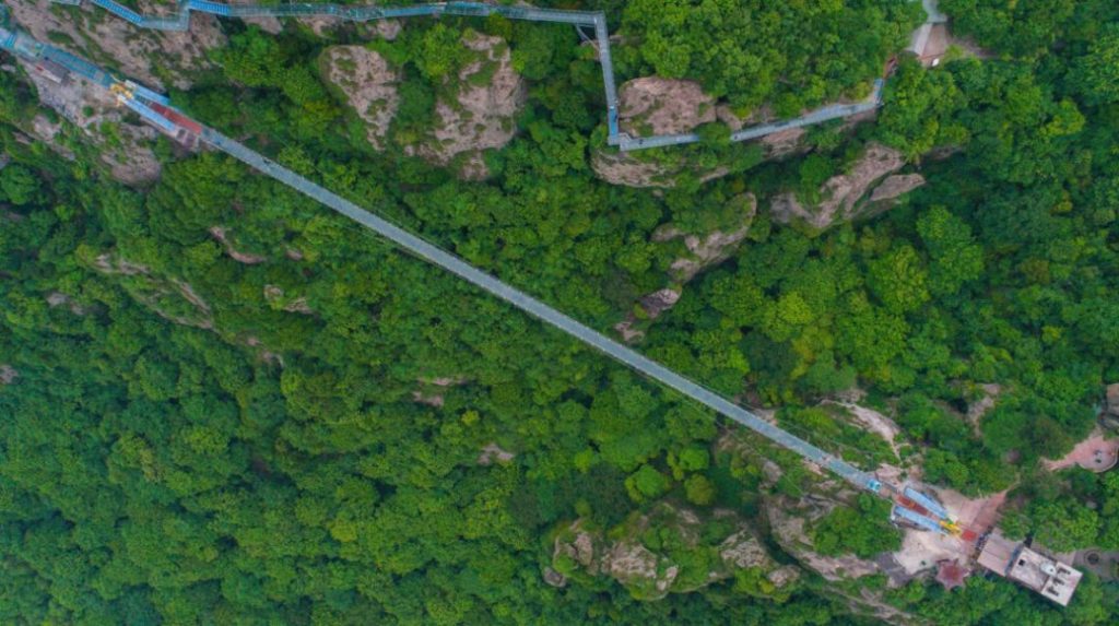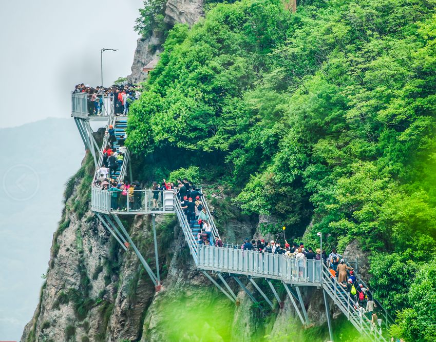 绝壁天梯玻璃栈道建于景区内雄伟的主峰——太阳山的悬崖峭壁之上。宛如一条巨龙,盘桓在峭壁之上。