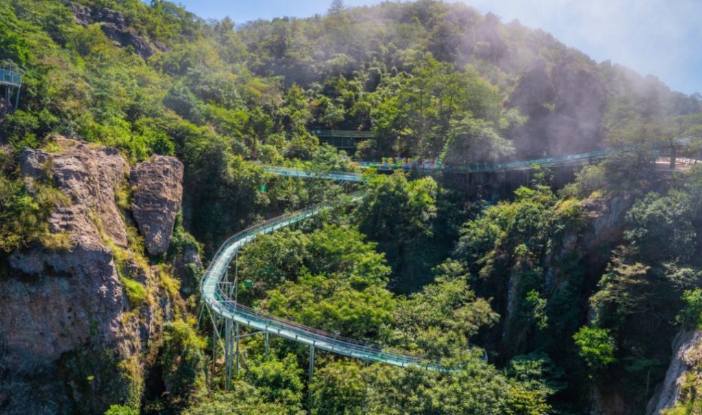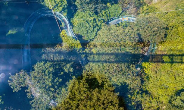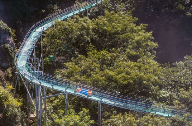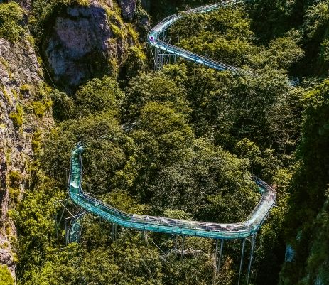 穿梭在茂密的原始楠木林,全景视野,放眼望去都是超美的风景。在2500米超长的玻璃滑道上,过山车般盘旋、弯曲、再盘旋、再弯曲~~