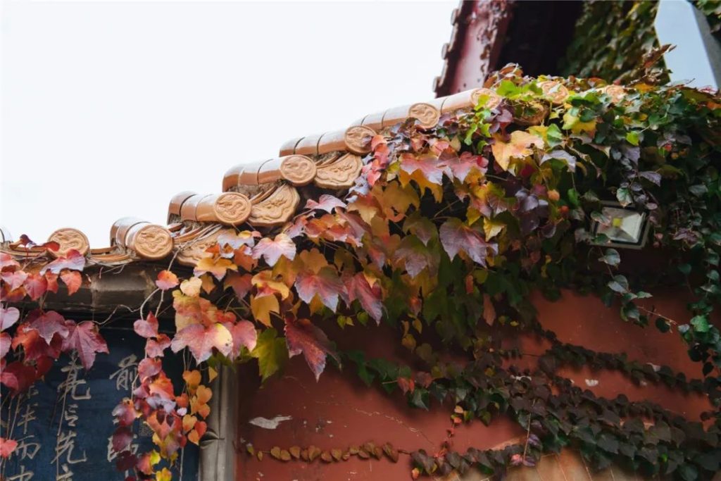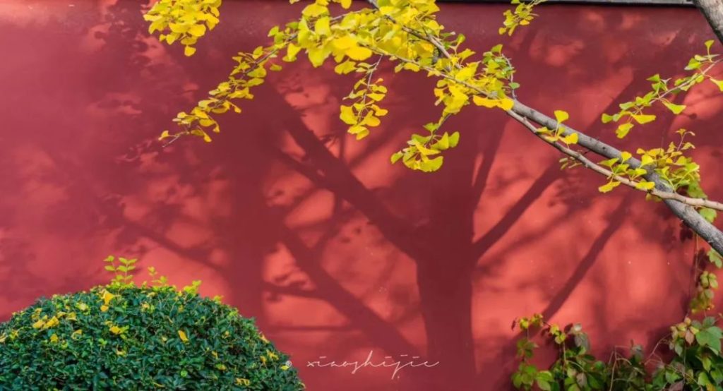 红墙与银杏相衬