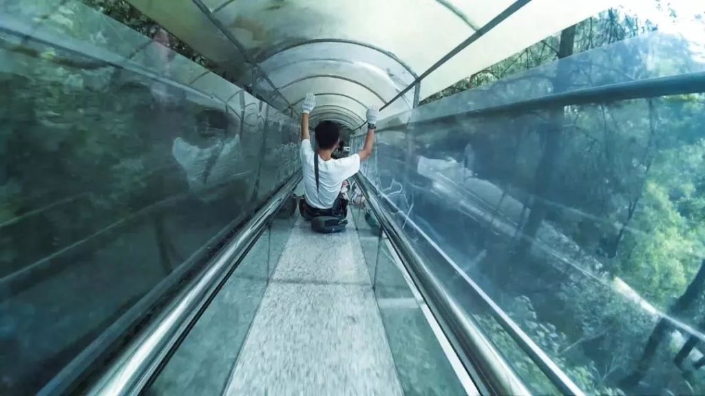 只要胆够大,让你享受凌空的刺激,当你踩踏在玻璃桥俯瞰山下的美景时,突然玻璃桥一片片碎裂的5D效果,你是否会吓破胆?