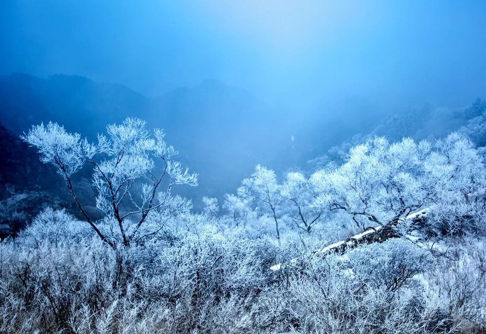 在洛阳白云山中,万千奇峰在风雪中矗立,玉皇顶,峭壁旁,皑皑白雪点缀其间,仿佛给大山披上了一件冰雪外衣。游道上覆盖着厚厚的积雪,犹如白色的地毯一般。漫山遍野皆是玉树琼枝,树木、果实、树叶上凝冻着厚厚的冰层,仿佛穿上了一件件冰晶铠甲。