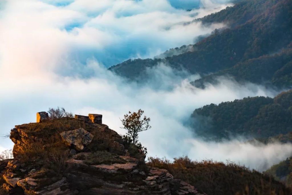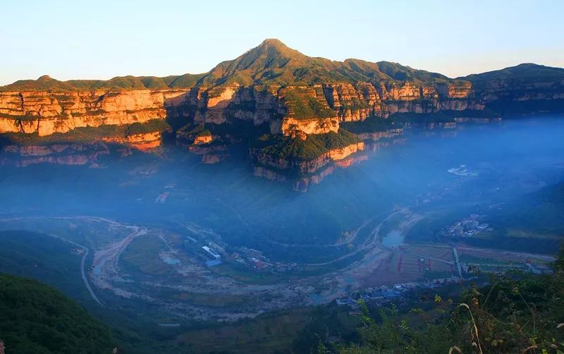 眺望远处,两侧山崖间一条蜿蜒的露水河平缓如镜,露水河两岸袅袅炊烟升起好似一幅人间烟火的画卷。
