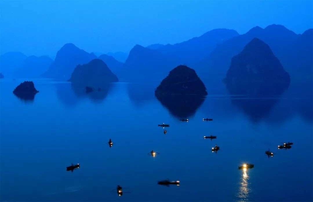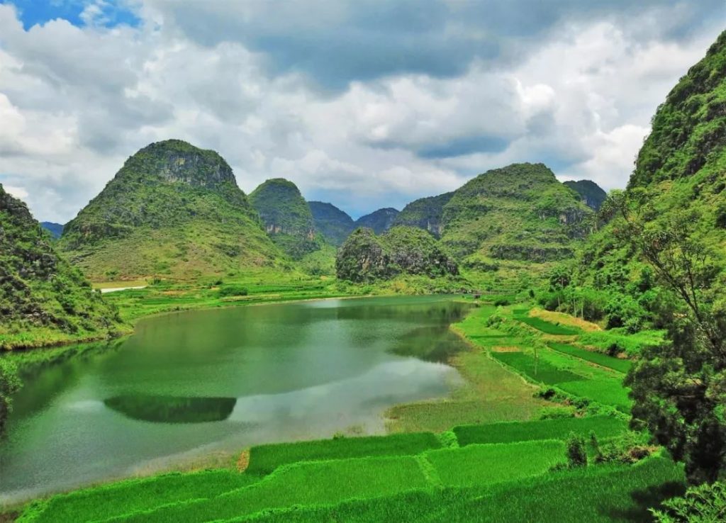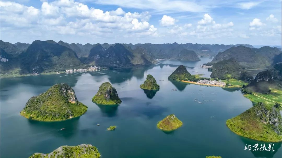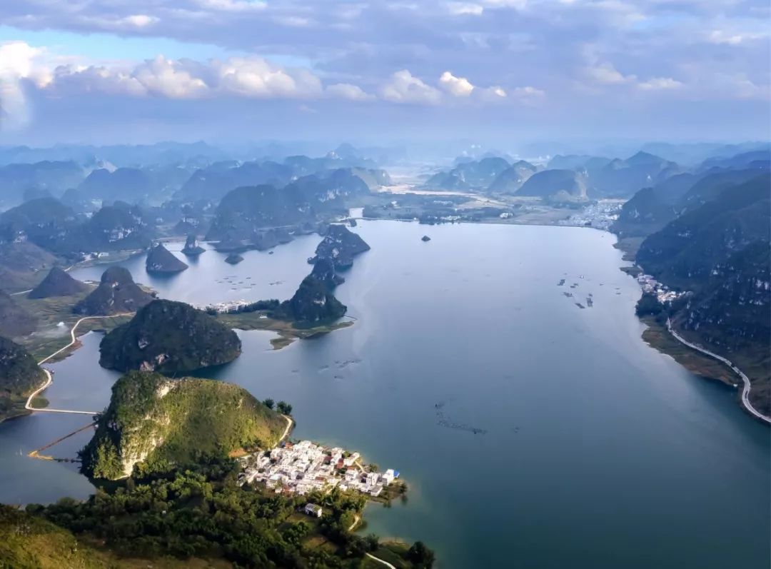 【渠洋湖】是一个大型的喀斯特高原湖泊。整个渠洋湖山环水绕,湖水清澈,秀峰如林,水面烟波浩渺,孤岛星罗棋布,翠竹、壮寨镶缀其间,山水相映,景致迷人,被誉为靖西山水的最佳代表。
