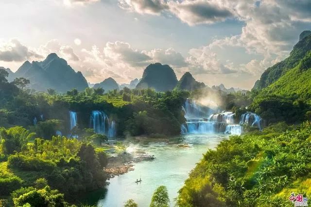 【德天跨国瀑布】位于广西壮族自治区崇左市大新县硕龙镇德天村,中国与越南边境处的归春河上游,瀑布气势磅礴、蔚为壮观,与紧邻的越南板约瀑布(“Bản Giốc & Đức Thiên”)相连,是亚洲第一、世界第四大跨国瀑布,年均水流量约为贵州黄果树瀑布的三倍。