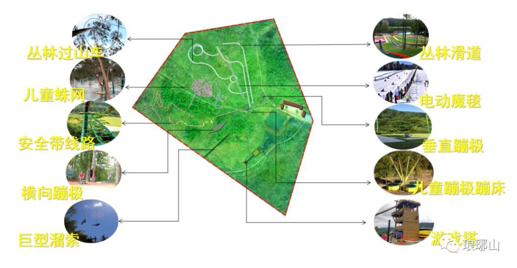琅琊山飞越丛林探险乐园项目共有11个大项目,分别是巨型儿童蛛网、霍比特屋、安全带线路、丛林过山车、超长双溜索、多种活动方式游戏塔、丛林滑道、电动魔毯、儿童蹦极蹦床、蹦极弹射、横向蹦极。所有项目均在丛林中建设。其中安全带项目、巨型儿童蛛网、霍比特屋线路将于2020年元月试营业。