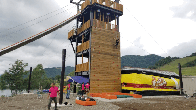 多种活动方式游戏塔,高度为15米。分为攀岩墙、跑步墙、速降、凌空飞人、滑道探险单元。