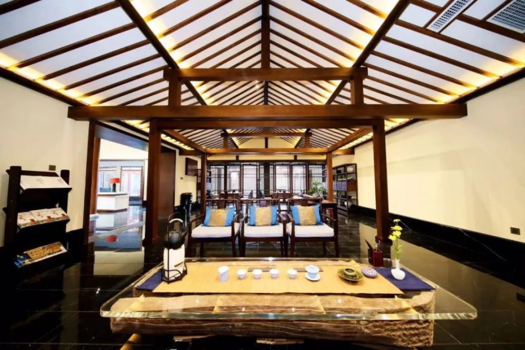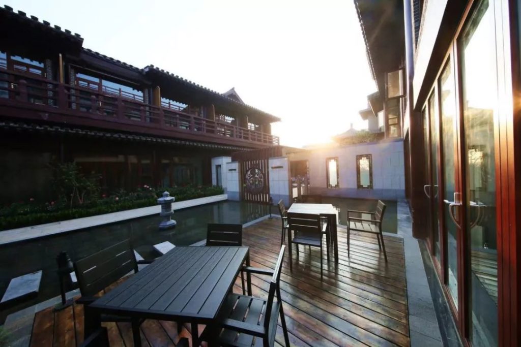 再看窗外,整体采用围合庭院设计,处处彰显宋氏美学,园内流水潺潺、意境深远。此刻,方能体会到时尚与古朴的巧妙融合,真可谓“花开满庭芳,一梦回汴京”。