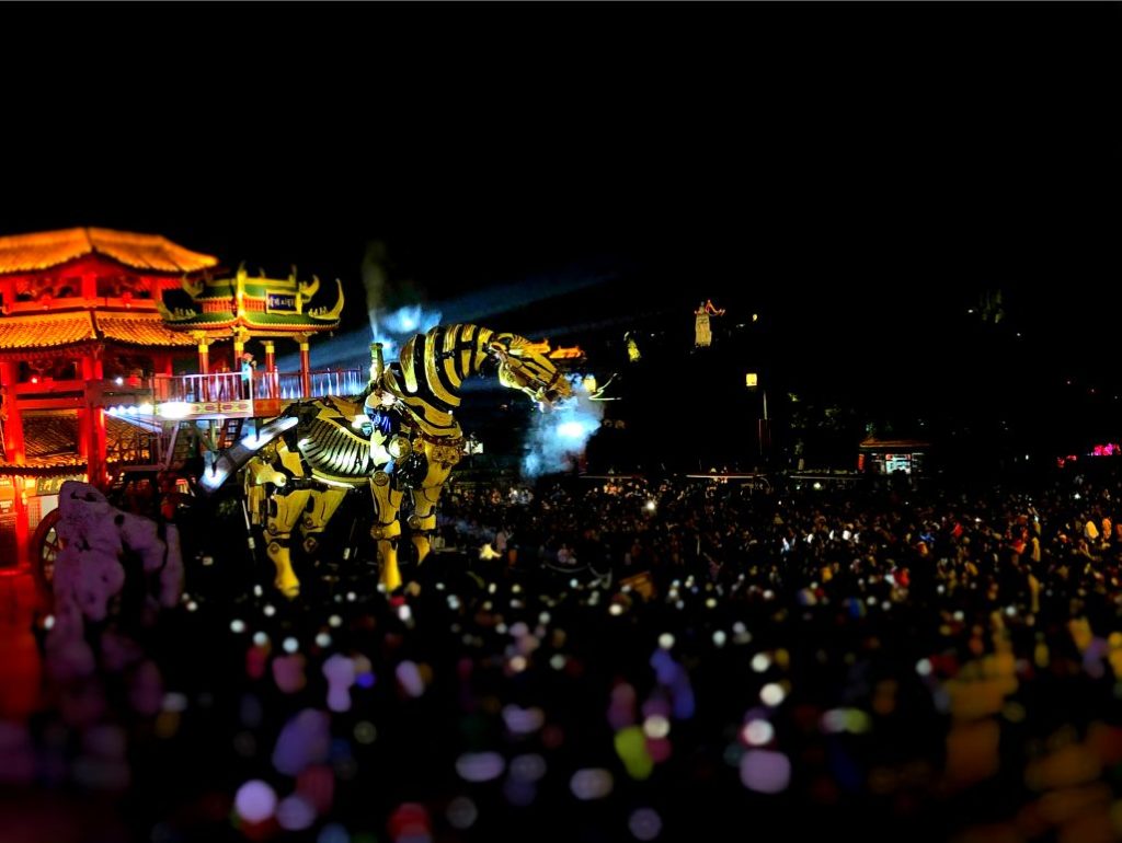 夜晚的第一个精彩,存在于中华巨马的身上,矫健的身姿在闪光灯汇成的星星海里更显神采奕奕。一声精气十足的嘶鸣声,拉开了清明上河园夜游的序幕。