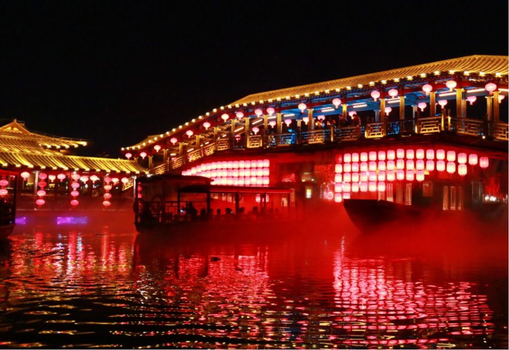 夜晚的第四个精彩,是从双亭桥码头出发,乘船夜赏新汴梁八景的体验,从《大宋·汴河灯影》到新汴梁八景,提升之后,更有韵味,更加浪漫。