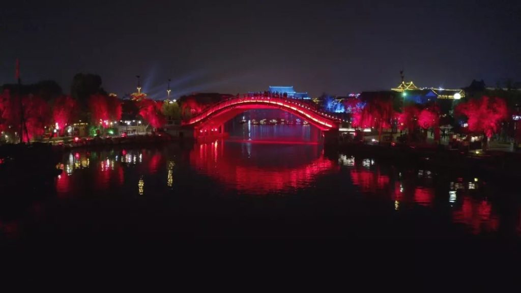 夜晚的第二个精彩,是沿着汴河的灯光,慢慢地,慢慢地靠近虹桥。看着虹桥越来越近越来越近,心情好像染上了彩虹的颜色,变得有些欣喜雀跃。虹桥,如果你有性别,一定是位身姿曼妙令人心动的姑娘。