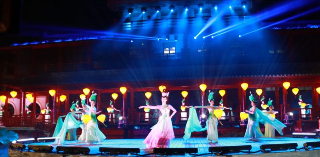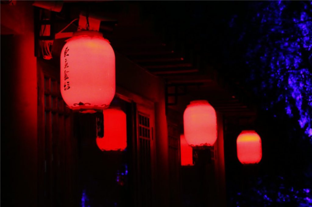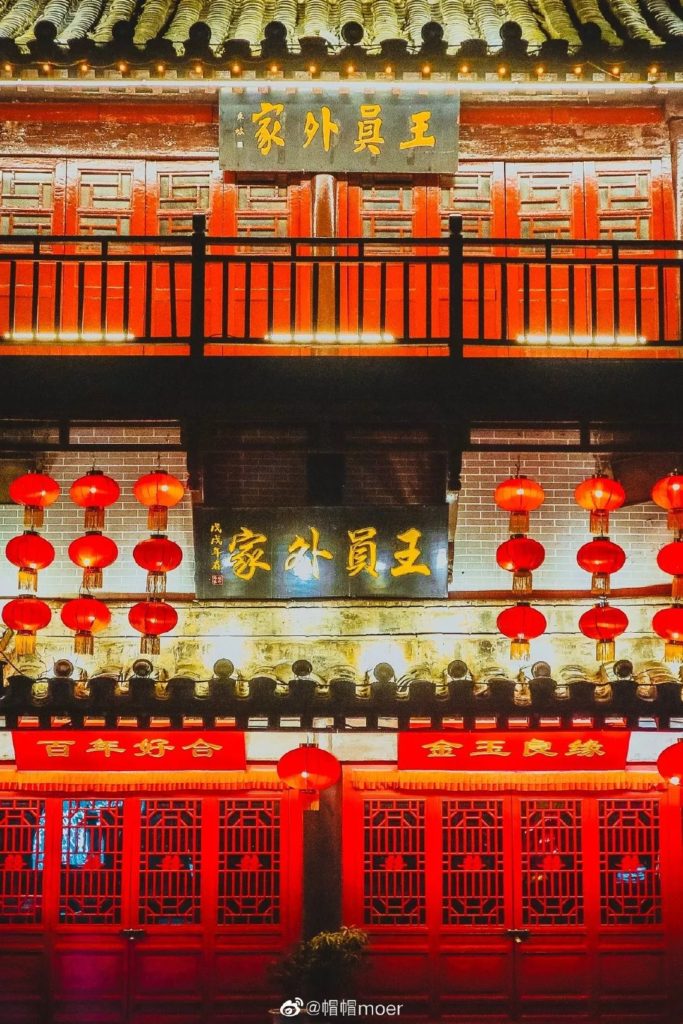 夜晚的第六个精彩,是王小姐的绣楼——王员外家,招亲时间已经过去,夜晚的绣楼像它的主人王小姐一样动人。门头上的百年好合和金玉良缘,好似在祝福着全天下的有情人终成眷属。