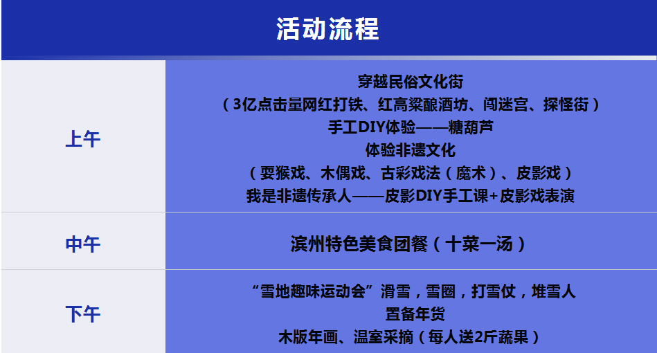 国家4A级旅游景区,它是一千三百年前的永安古镇,黄河故道所在地,古村落淌鲁北民居特色之血脉,融乌镇江南水乡之风韵,小桥流水、绿树环绕幽远宁静,一个来过就印在心间的人间仙境,在这里你将找到已经消失或即将消失的民间技艺,寻找梦境里经常出现的乡韵乡愁,让许多的留恋和遗憾变成一次次的探访和追寻…… 赏——非遗表演:耍猴戏、古彩戏法、拉洋片、木偶戏、皮影戏 学——民俗风情:看花灯、5亿点击网红打铁、红高粱古法酿酒 做——DIY手工体验:diy糖葫芦、古长安皮影制作 玩——“雪地趣味运动会”滑雪,雪圈,打雪仗,堆雪人吃:滨州特色美食、温室采摘新鲜蔬果 写福字–中国传统文化中非常重要的一部分。当人们在自己的家门口贴上春联的时候,意味着春节正式拉开序幕。每逢春节,无论城市还是农村,家家户户都要挑漂亮的红春联贴于门上,辞旧迎新,增加喜庆的节日气氛。让宝贝们亲手写下新的一年的祈福带回家,一定是一份美好的回忆。 记忆里,糖葫芦多被插在草把子上,是赶集上会的时候才能够享受到到的美味。小时候一串只需两毛钱,红红的果子包裹着一层糖汁,咬一口黏牙,吃在嘴里、脆的、甜的、然后才是酸的。这次小朋友和爸爸妈妈就要一起亲手做一串糖葫芦,给孩子一个特别的童年回忆。 拓印年画——中国历史悠久的汉族传统艺术形式,有着一千多年的历史。木版年画内容多与当地乡土民俗密切相关,直观展示了当地社会民俗、文化生活,寄托着人们向往太平安宁的美好象征;木版年画雕工精湛,用色浓烈大胆,被国外收藏家赞誉为“东方智慧的结晶”,具有深厚的文化价值和艺术价值。2006年,木版年画还被列入国家级非物质文化遗产项目。 来到有机蔬菜大棚采摘无公害水果黄瓜、圣女果等!体验收获的乐趣! 俗话说,冬天最有意思的就是滑雪,走进滑雪场,换上雪板,拉起雪圈,尽情的雪地中玩耍! 古村落的土菜馆,坐在老式的房间里,看到旧的报纸,仿佛有一种穿越的感觉,荤素搭配、营养丰富的菜品散发着香气,让我们沉浸其中,享受这饕餮盛宴! 费用包含:餐饮、交通费、所有活动费、材料费及道具费转载请注明来源:风光网视 » 记忆中的年味—古镇寻味、鲁北年俗、滑雪一日营