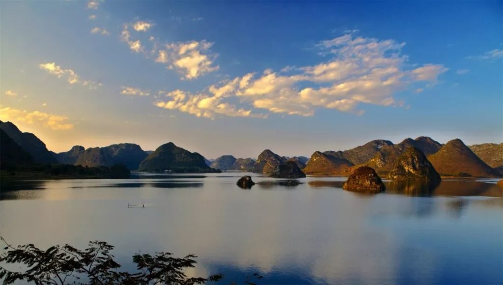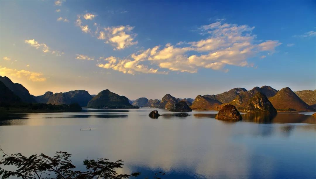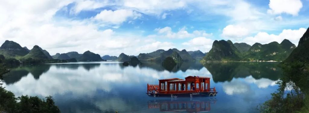 微风徐来,渠洋湖的水面上,波光粼粼。渠洋湖是典型的喀斯特高原湖泊,山环水绕,秀峰如林。