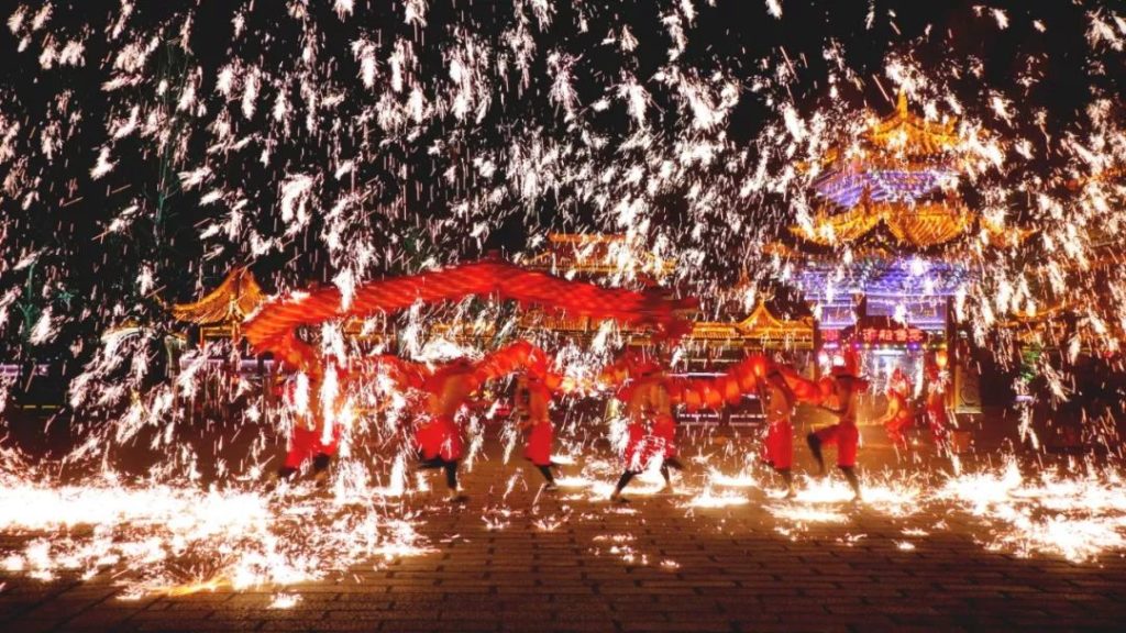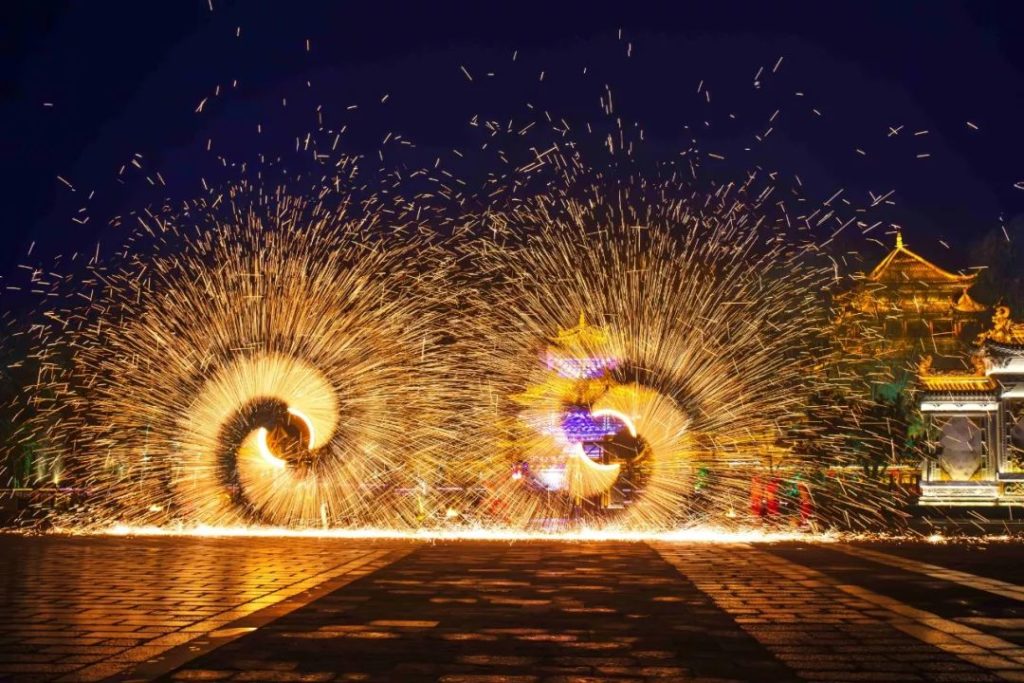 国家级非遗表演《火龙钢花》,这个寓意着“风调雨顺,国泰民安”的表演,让古城复兴广场瞬间火雨纷纷,星落遍地,只见一条红色的长龙在火雨中逡巡、游走,铁水师傅大喝一声,手一抛、再一击一瓢铁水飞上高空十多米,如红色烟花般绚烂。