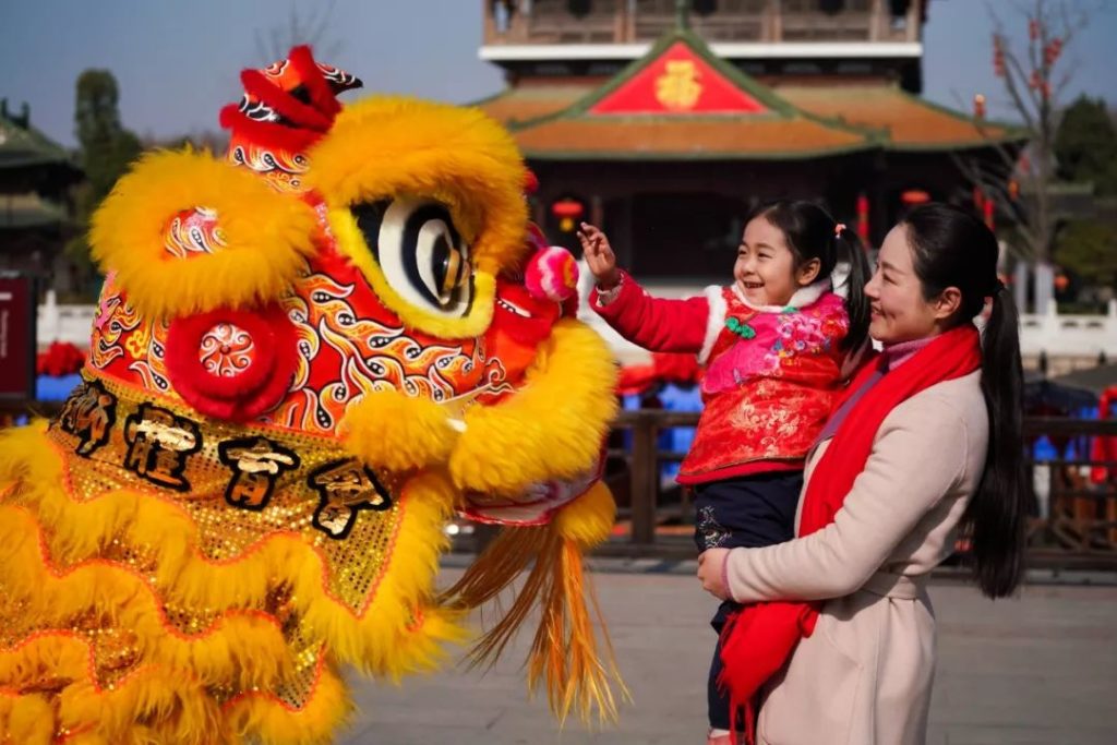 舞狮作为一种民间传统表演艺术,蕴藏着中华民族特有的精神价值,每每上演,总是让人心潮澎湃。南狮在乐点引导下,表演腾翻、跳跃、登高等技巧,还有搔痒、抖毛,欢腾跳跃,辗转腾挪,吐出对联“风调雨顺,国泰民安”,游客们不时地发出惊叹,为演员们鼓掌呐喊。