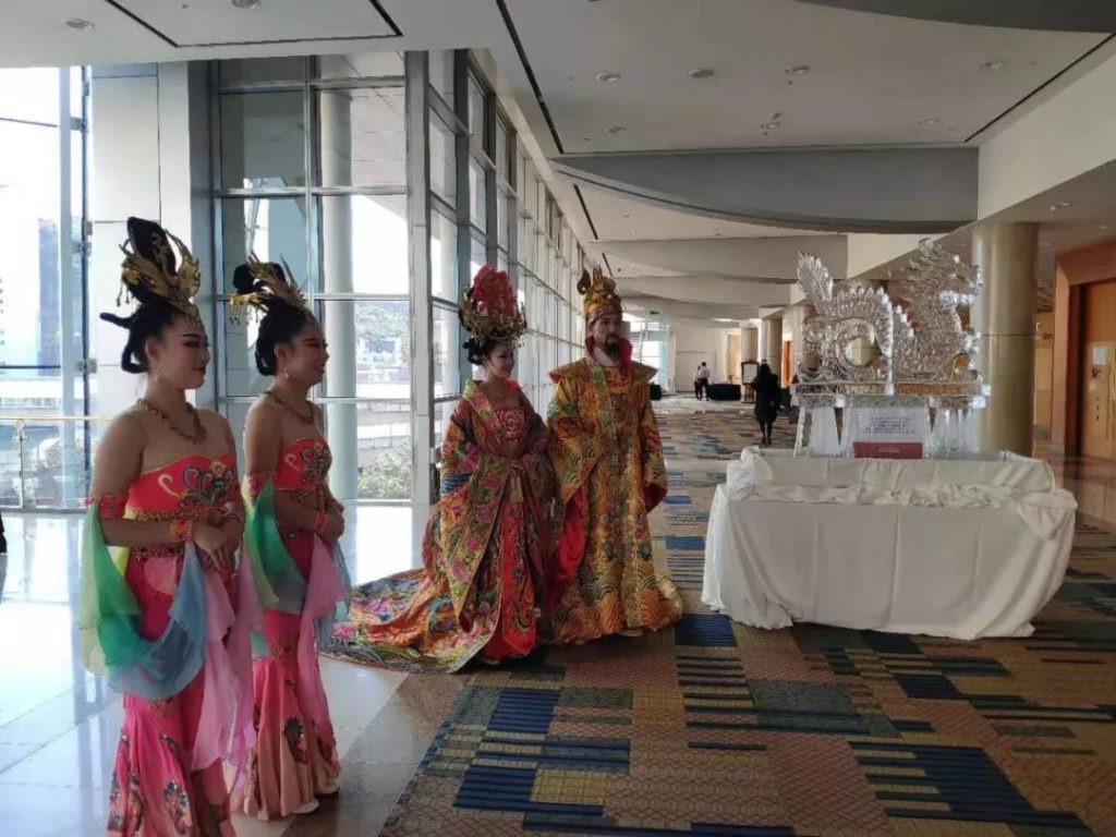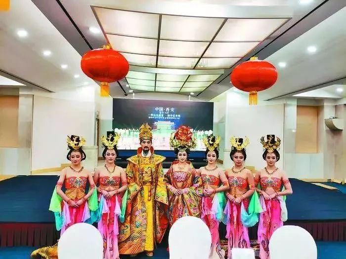 华清宫景区作为国家首批5A级景区、唐文化标志性景区,向与会嘉宾带去了精美绝伦的《踏歌》、《七夕》等唐宫舞蹈,同时,还在现场赠送了代表着大唐文化的文创礼品,让参会嘉宾感受到浓浓的大唐热情。演员们着唐玄宗和杨贵妃的精美华服,更是吸引韩国市民争相合影。