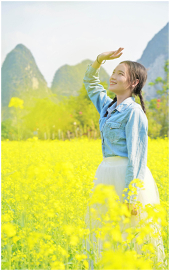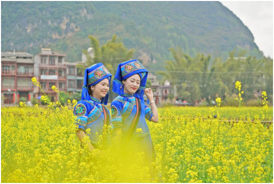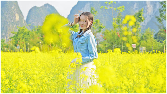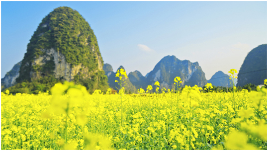 在青山绿水的衬托下,靖西旧州、鹅泉的油菜花沿河流开满山谷,一望无际的金黄显得格外绚烂,像一幅巨型画卷,近百亩的大色块简单构图具有十足的山水画卷意味。身处美境,翩然若仙。花海跨年在旧州、鹅泉,便服民族总相宜。