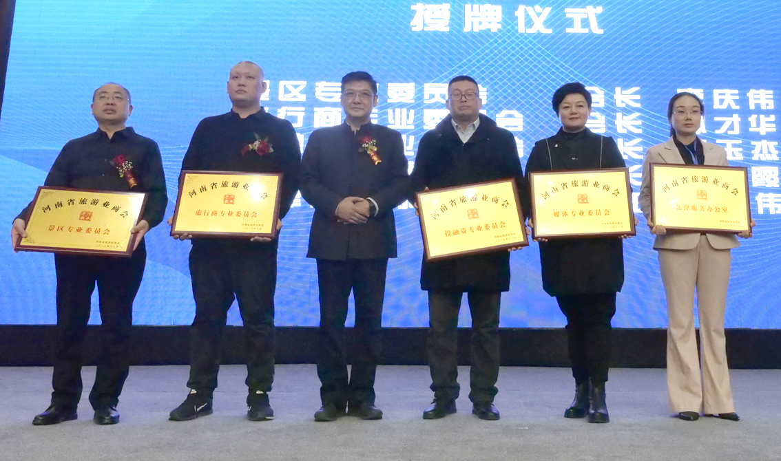 会议期间,河南省旅游业商会会长王小满向景区专业委员会会长李庆伟、旅行商专业委员会会长孙才华、投融资专业委员会会长贾玉杰、媒体专业委员会会长王霞、法律服务办公室主任单艳伟授牌。
