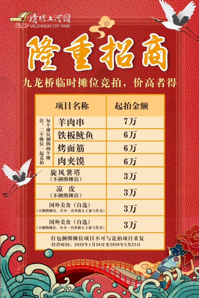 转载请注明来源:风光网视 » 春节招商,2020年清明上河园宋潮美食节临时摊位公开招标啦!