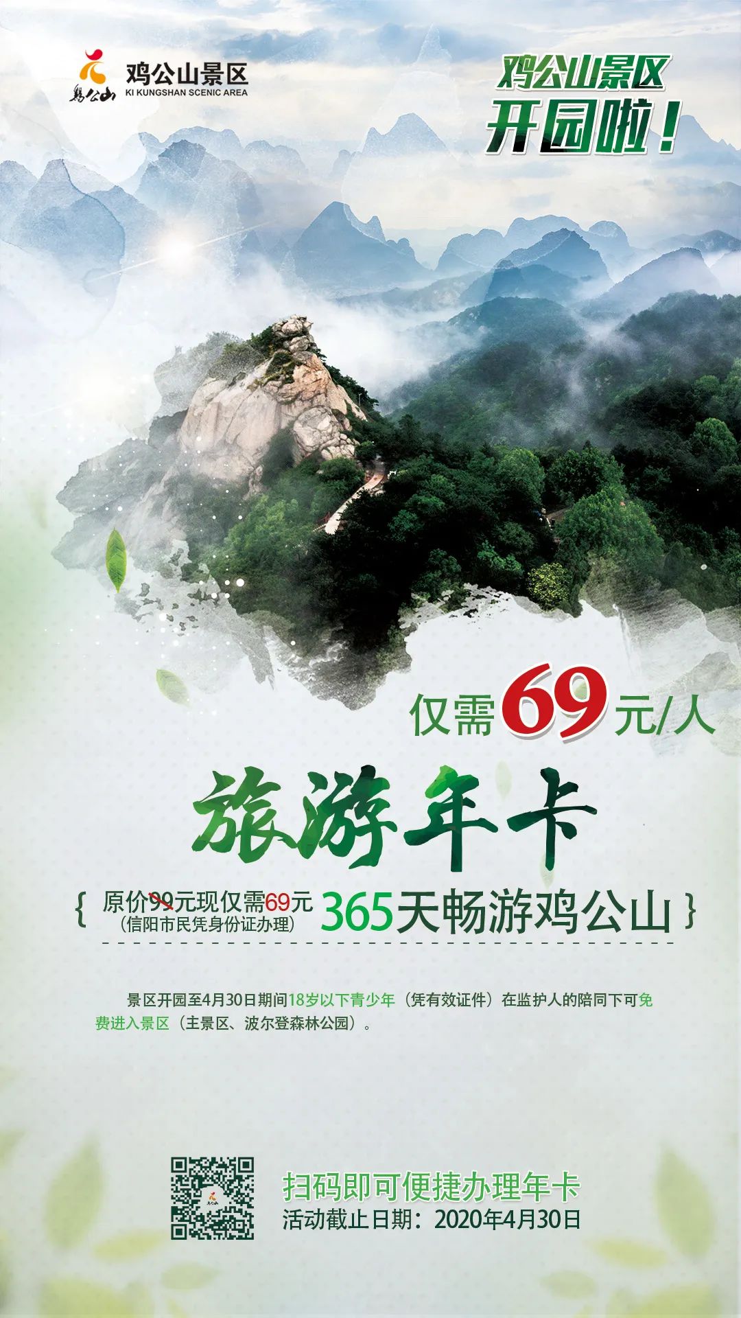 2、4月30日前凡购买鸡公山景区全价票(60元/人)的游客,加9元即升级为鸡公山景区年卡用户(原价99元/人,信阳市民凭身份证办理)。