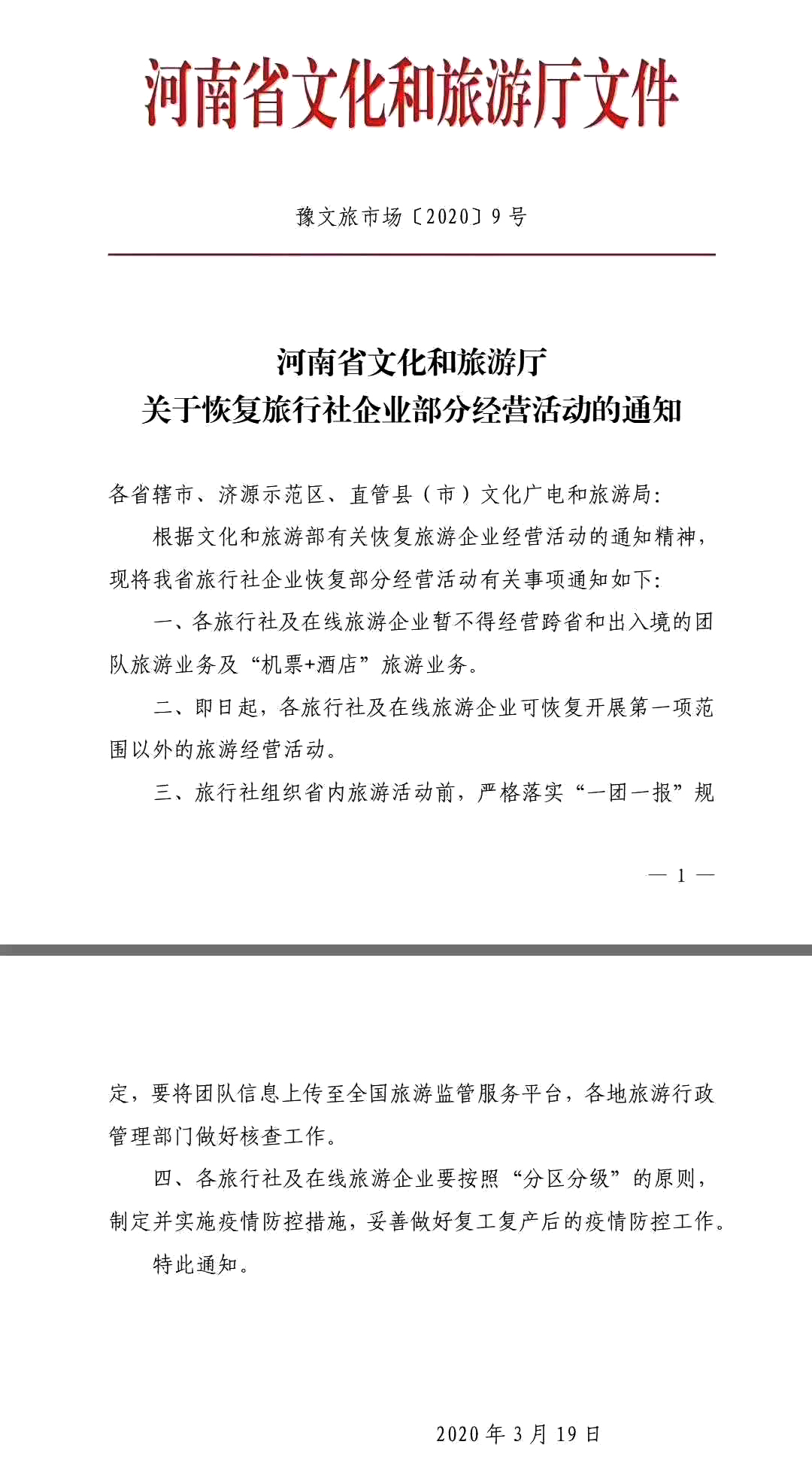 河南省旅行社企业已恢复部分经营活动