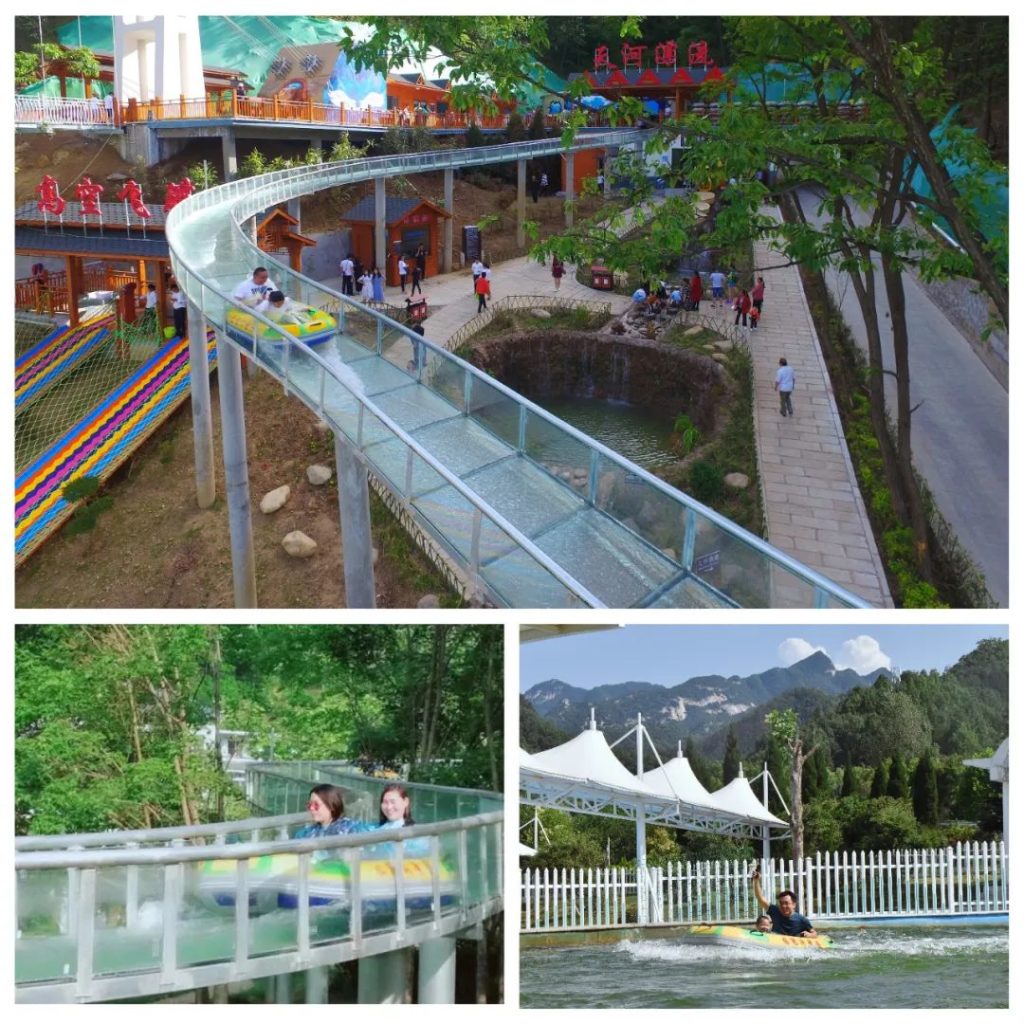 鸡冠洞景区天河漂流,全长1800米,上下落差80米,上至幸福桥,下至入园检票口百花坡。 高空漂流路线蜿蜒曲折,穿丛林,越花海,浪花飞溅,激流勇进、惊险刺激、安全生态、欢乐无限,是河南省内首条高空玻璃漂流,成为中原首创。