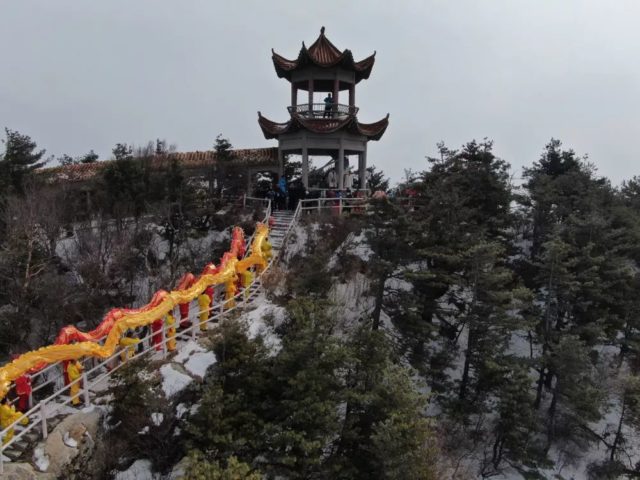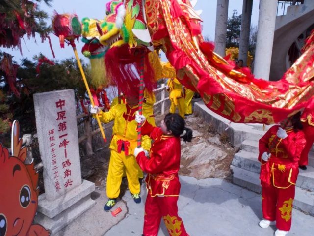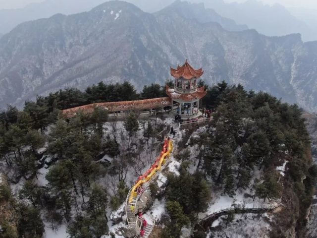 农历二月二,民间俗称“龙抬头”。洛阳栾川当地民众在龙峪湾景区悬崖绝壁间上演舞龙祈福活动。 巨龙伴着锣鼓声在陡峭的悬崖峭壁间时而俯首而冲,时而一字前行,时而二龙戏珠,上下飞舞,盘旋与海拔2222.5米中原第一峰鸡角尖,甚为壮观,吸引了一批当地民众和外来游客驻足观看。 二月二“龙抬头...